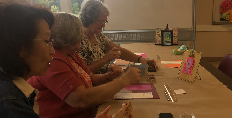 We set up the tables so that there were little buckets in between each person with a couple of ink pad choices and stamps, glue sticks and some washi tape. After demonstrating the correct way to stamp, everyone gave it a try on a white strip of paper. I was running around trying to clean everyone's stamps if they wanted to experiment with another color. Everyone seemed to take to the stamping! Some had never done it before but most people there were familiar with how to go about doing it. Next, we had them use the stick to adhere their decorative strip of paper onto the 12X12 bright cardstock. After that, we showed them how to use a tape runner by demonstrating how to line an envelope. We would say by the reaction, they were very impressed at how easy and beautiful the outcome of lining an envelope is. They then got the opportunity to try the tape runner to adhere their stamped strip down on the side of their paper. We could hear the enthusiasm as everyone used it and it was clear they loved this type of adhesive better than the glue stick! Next, we had them use the decorative washi tape to adhere a 4X6 piece of bright cardstock to their paper. This was the designated spot to display a picture or a memento. They loved the color choices and put the strips of tape on their cardstock all in different ways, which was so nice to see! After about 45 minutes, everyone had arranged their page how they wanted it and were holding the pages up proudly for us to take their picture.